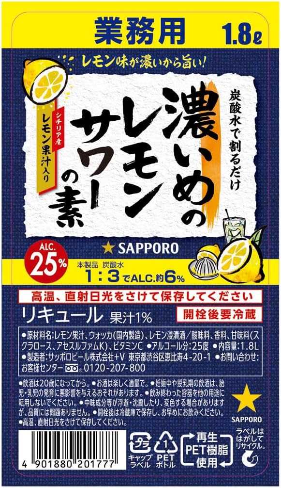 삿포로 진한 레몬 사워의 소 1800ml 20도 (원액) 무료배송 – 업소용 대용량 상큼톡쏘는 레몬 칵테일 베이스