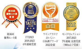 세계 최대 규모·최고 권위로 평가되는 IWC(인터내셔널·와인·챌린지) 2023에서, 키쿠 마사무네 「시보리타테 긴팍쿠」가 혼죠조슈 부문 골드 메달의 「최고위 트로피」를 수상.그 밖에도 지금까지 수많은 수상 경력을 자랑하는 긴 팩.