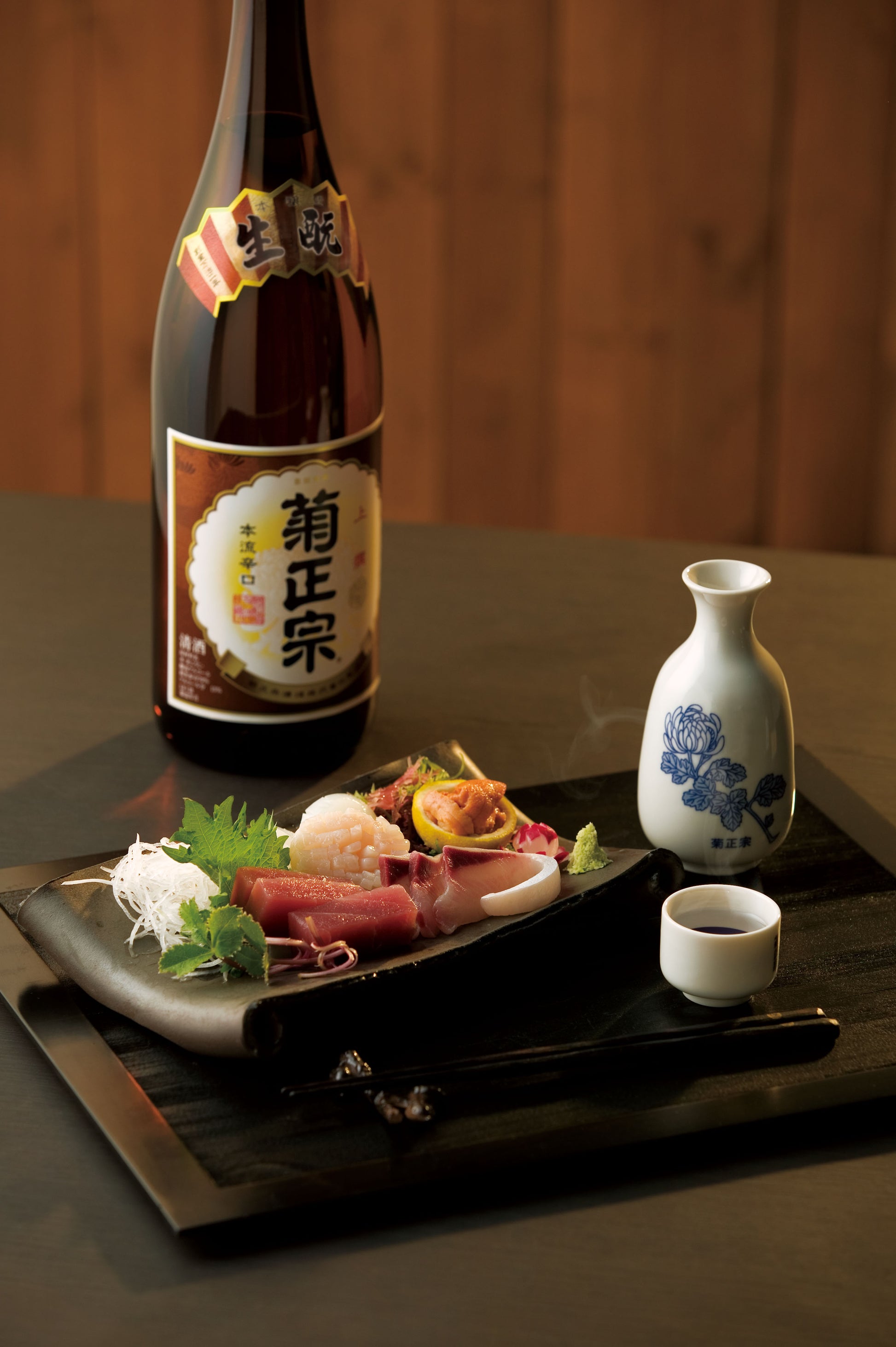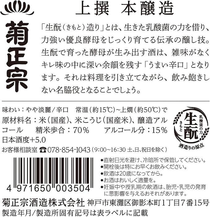 「키쿠 마사무네 죠우센」은 360여년의 역사를 가진 고베시의 주조 키쿠 마사무네의 전통적인 제법 (우에모토 양조법 : 살아있는 젖산균의 힘을 이용하여 강력한 효모를 배양하는 전통적인 술 제조법) 으로 쌀과 쌀 누룩을 사용해 양조 알코올을 더해 독특한 풍미를 끌어내는 유명한 혼죠슈 입니다.